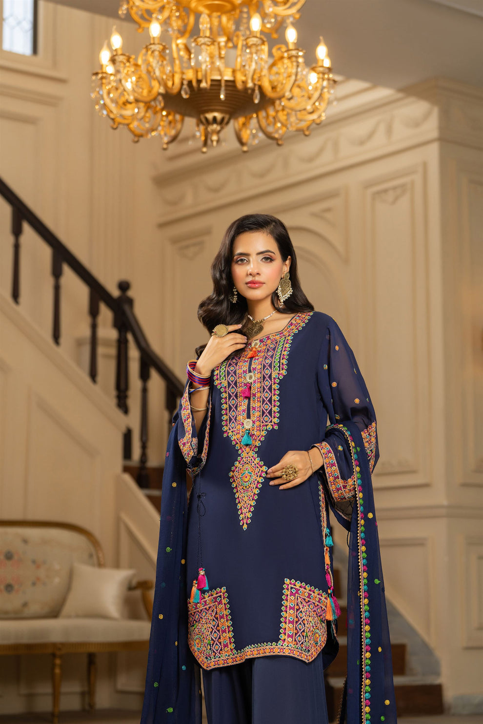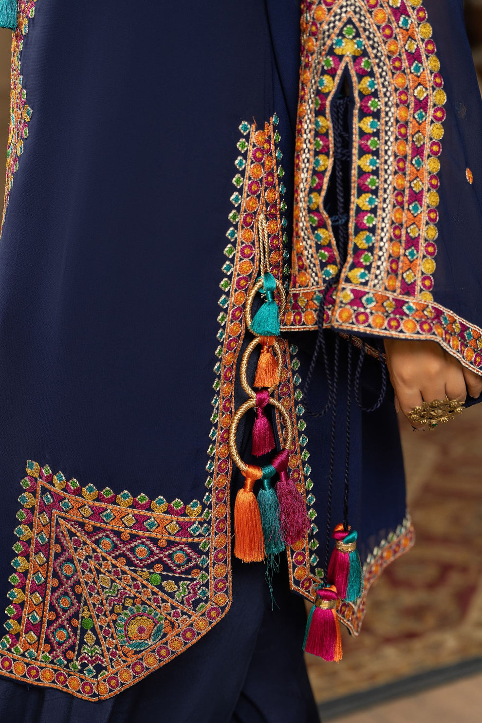 • Shirt: Premium Georgette Chiffon with intricate multicolor embroidery, tassels on chaak, and dori-detailed sleeves.